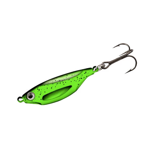The Flash Bang provides anglers an edge over traditional rattle spoons on the market with an attracting gamefish from a distance. The chamber is integrated into the spoons body, preventing it from breaking off. The integrated glow stick will attract fish with hours of uninterrupted glow without the need of recharging. Available in a variety of premium UV, holographic, and UV glow finishes and equipped with premium black nickel hooks, the Flash Bang is a weapon of choice anywhere there is water.