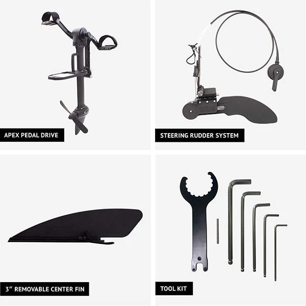Included Items: (1) APEX Pedal Drive, (1) Steering Rudder System, (1) 3″ Removable Aero Center Fin, and (1)Tool Kit