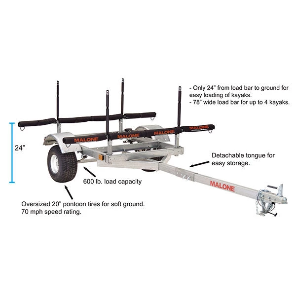 The LowMax™ has a 600 lb capacity leaf spring suspension system that delivers a smooth ride under full load. The 78” wide cross bars provide plenty of space for carriers & gear. With the bars positioned only 24” from the ground, loading and unloading heavy boats has never been easier. The 20″ diameter by 8″ wide pontoon-style tires have a maximum speed rating of 70 MPH which is perfect for most roadways.