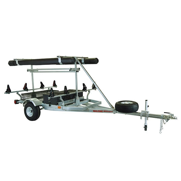 The MPG550-AM MegaWing MegaSport trailer package is bundled with MegaWing cradles, spare tire kit, sliding storage drawer, 2nd tier load bars, wet gear basket, two sets of rod storage tubes and milk crate cage.