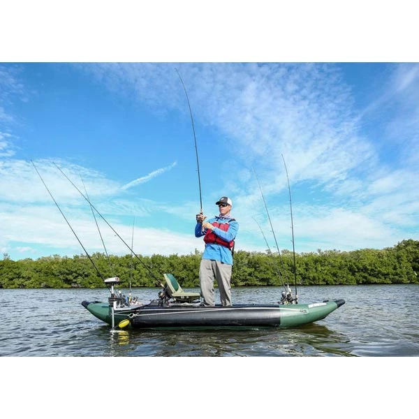 Featuring: double layered, nearly indestructible, tough as crocodile hide, 2000 Denier reinforced protective layers, 6 built-in rod holders, forward and aft spray skirts with Sea Eagle exclusive accessory belts to hold your tools, hooks, and lures, a fully adjustable foot brace called the FlexBraceâ„¢, 40″ FishRulerâ„¢, anchor trolley D-rings, a huge max load capacity of 575 lbs., and is completely self-bailing. So bring on the roughest conditions and still get to those fish!