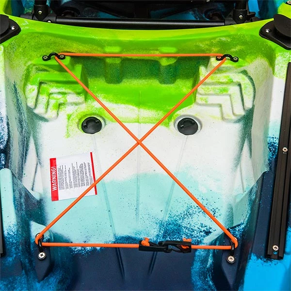 Should you wish to free up your hands while paddling, there is the option to remove the toolbox and replace it with the included Fin drive or the optional Prop drive. With the Fin or Prop drive installed, your hands can get busy casting out a lure or simply snapping a great picture on your phone or camera. At the bow of the Zambezi, there is an additional hatch that is perfect for stowing your anchor or safety equipment. This hatch has cross-braced bungee reinforcement to secure and safeguard your equipment.