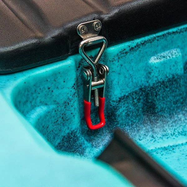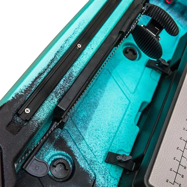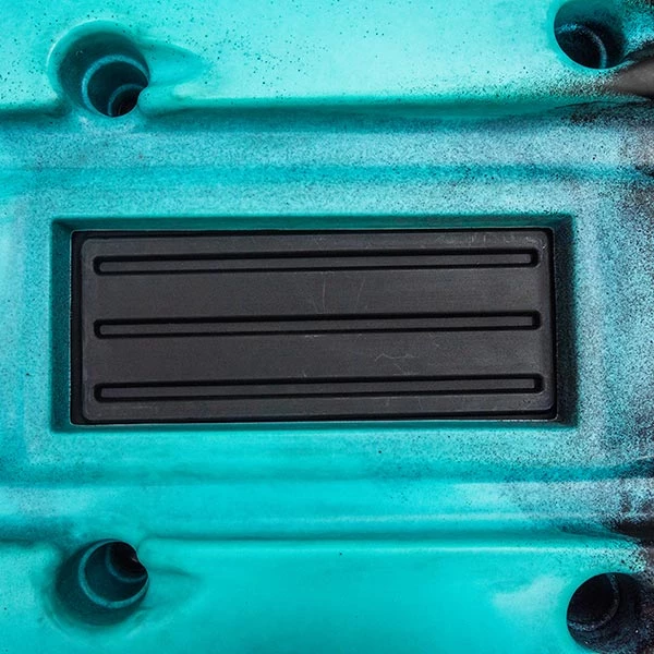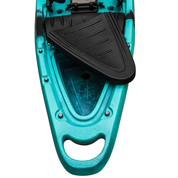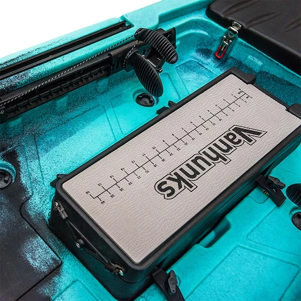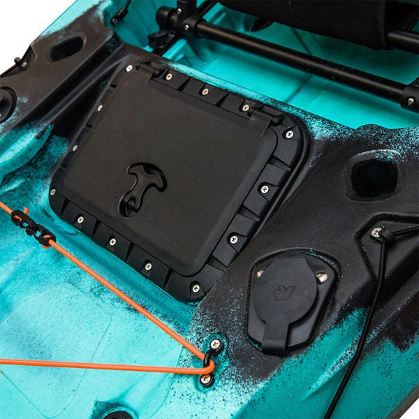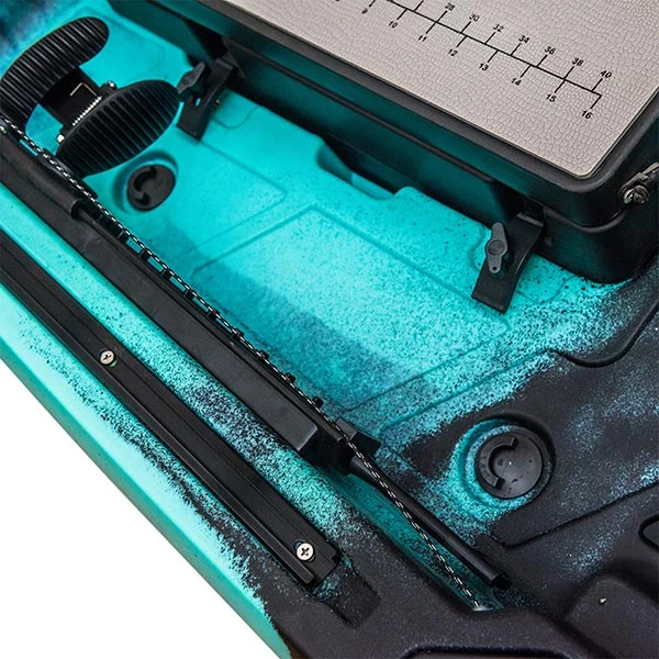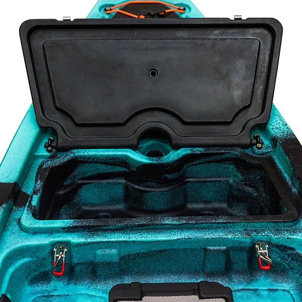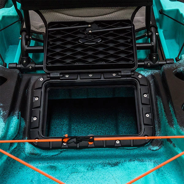 Below the bow hatch, a center console hatch opens towards the paddler, allowing for easy reachable access. Positioned In front of the raised aluminum seating is the toolbox hatch to set up your fishfinder. The toolbox has enough space for your sealed lithium battery and extra cabling to keep your deck free of clutter and wiring. Regarding the transducer, there is a scupper plug with a perforated hard 4mm nylon cover with brass inserts to easily mount your sonar, and this is close to the toolbox, limiting the amount of wiring length needed.