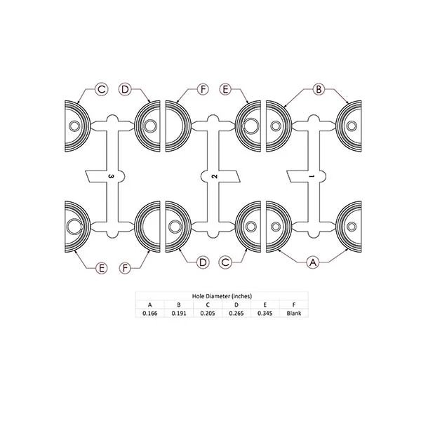 - Hole Diameter Sizes: A 0.166″, B 0.191″, C 0.205″, D 0.345″, E 0.345″, F Blank